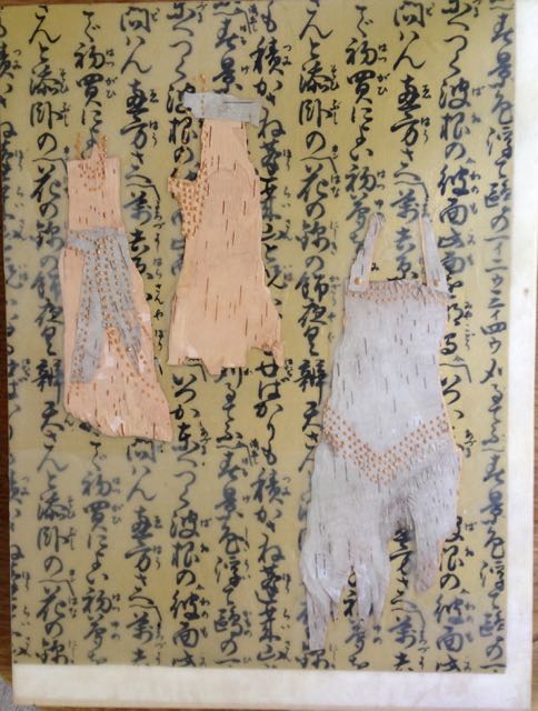 Birch Dress #1 Encaustic with birch bark, paper and india ink on birch panel 8″ by 12″ Marion Meyers SOLDBirch Dress #4 Encaustic, paoer & bark on birch panel 11″ by 14″, SOLDA Trio of Dresses Encaustic with paper on birch panel 12″ by 9″, Marion Meyers, $300